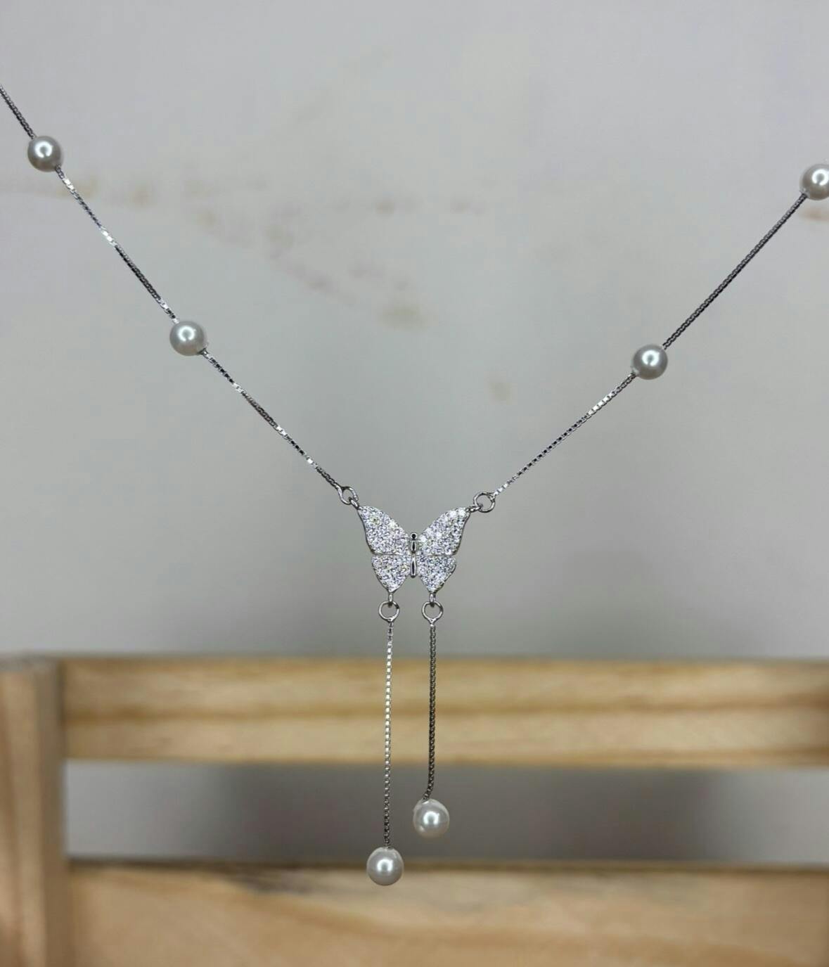 Delicate, dreamy, and full of grace — the Aurelle Butterfly Pearl Drop Necklace is where elegance meets whimsy. Crafted in 925 Silver, this necklace features a shimmering butterfly centerpiece encrusted with fine stones, with evenly spaced pearls along a sleek silver chain. Twin pearl drops add soft movement, making it a perfect accent for both day and evening looks.