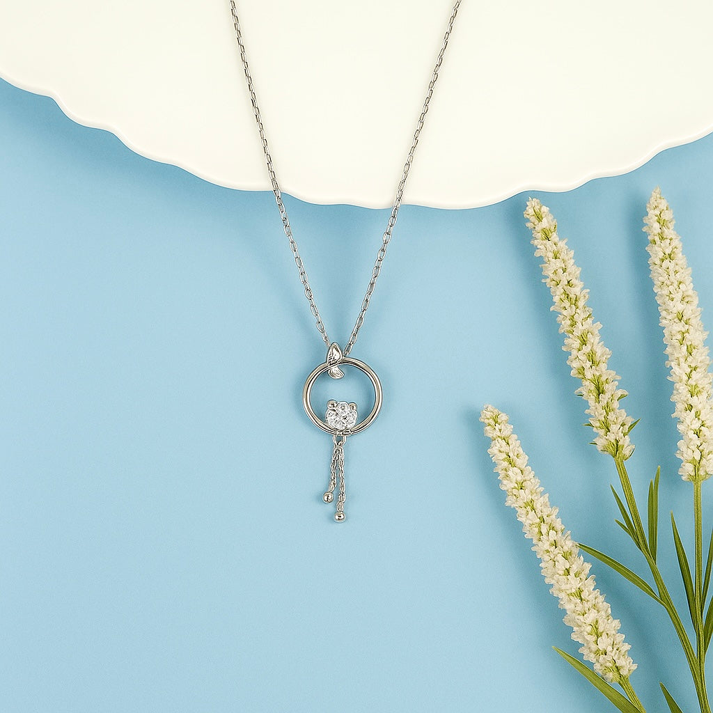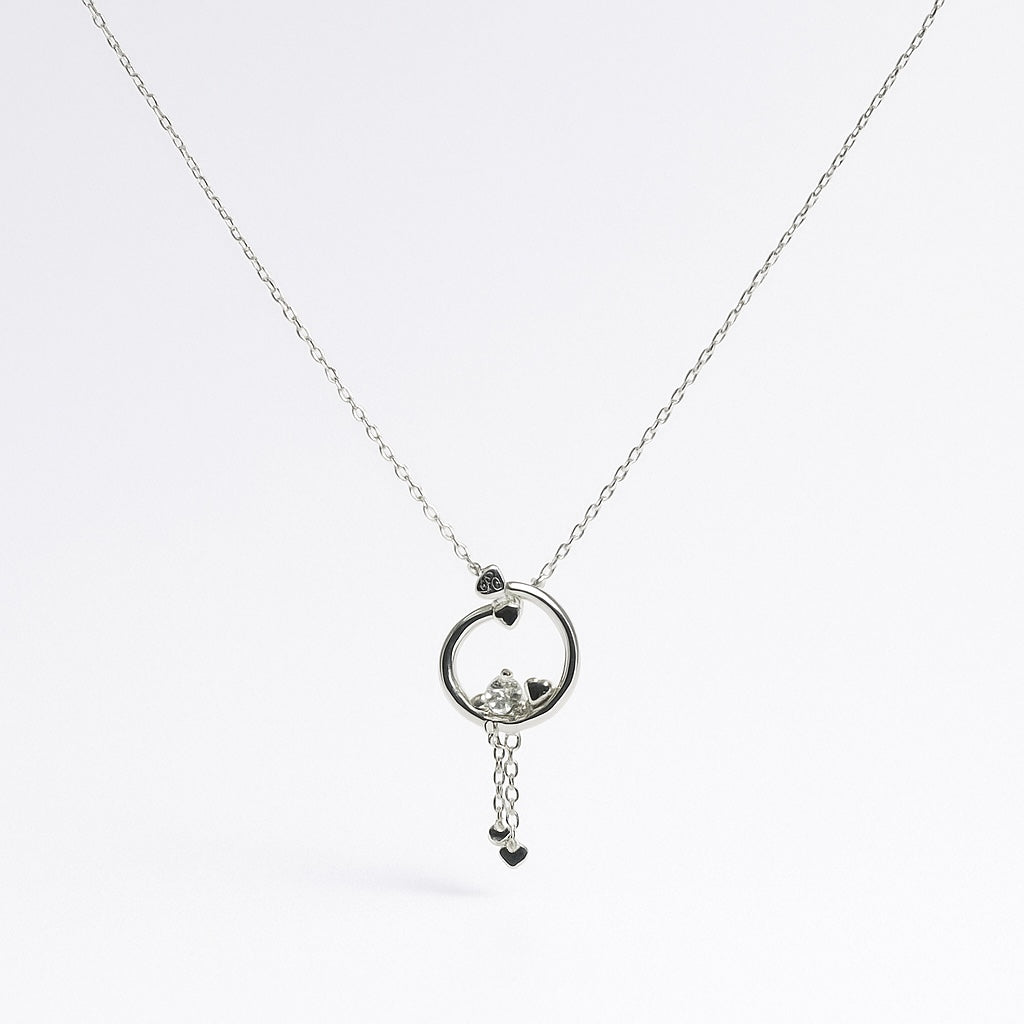 This captivating necklace features a delicate 925 sterling silver chain, suspending an intriguing circular pendant. Within the open circle, a brilliant, heart-shaped stone sparkles alongside a smaller, darker heart, symbolizing a deep connection. From the bottom of the circle, a charming cascade of two tiny hearts adds playful movement, making this piece a heartfelt and unique adornment.