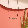 This elegant mangalsutra offers a fresh take on tradition, combining a sleek silver-toned chain with a segment of classic black beads. The centerpiece features a gracefully curved bar meticulously set with sparkling cubic zirconia, from which five delicate pear-shaped CZ droplets gracefully descend. It's a refined and modern design, perfect for adding a touch of sophisticated sparkle to your ensemble.
