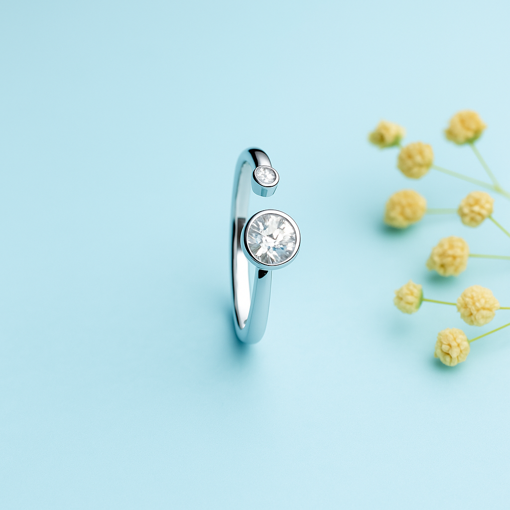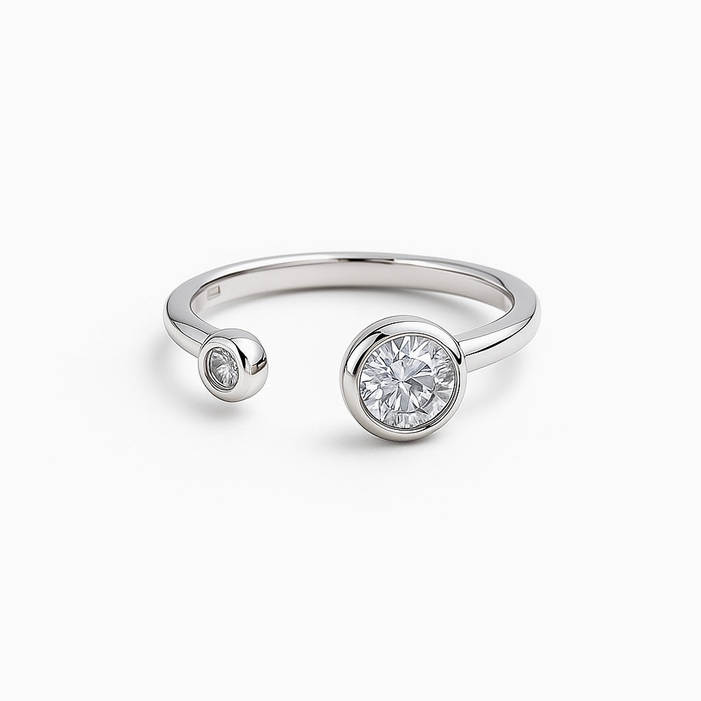 This modern 925 sterling silver adjustable ring showcases a sophisticated open design, featuring two brilliant, bezel-set diamonds of differing sizes. Its minimalist elegance highlights the individual sparkle of each stone, creating a unique and contemporary statement piece perfect for any occasion.