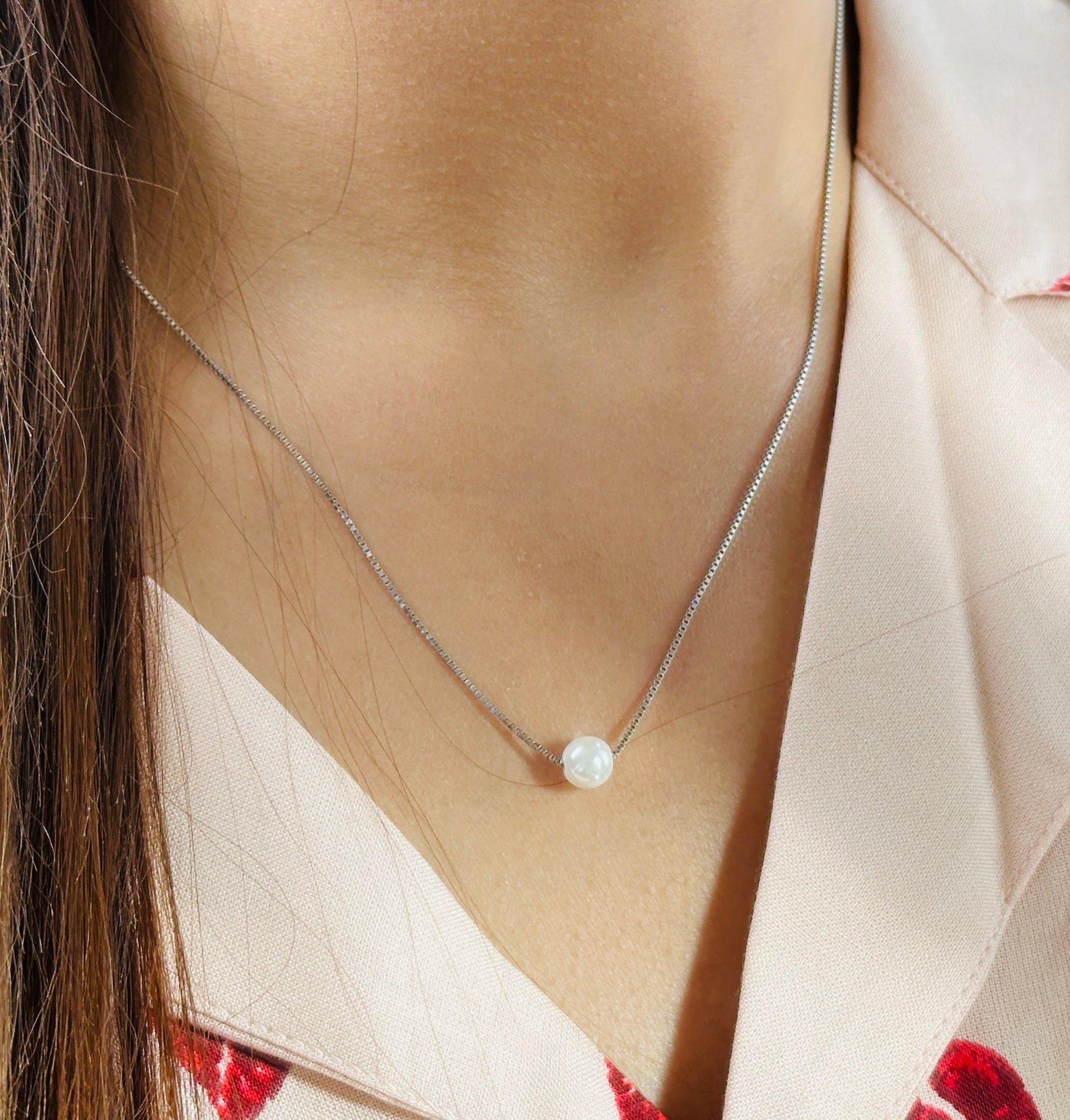 A minimalist beauty—this necklace features a single lustrous pearl on a sleek sterling silver chain. Effortlessly elegant, perfect for both everyday and special moments.
